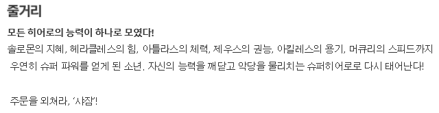 샤잠의 주인공은 엄청난 능력을 갖춘 소년으로 샤잠으로 변신하면 소년이 아닌 어른 슈퍼히어로가 됩니다.