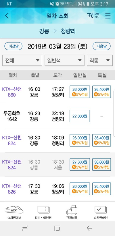 돌아올 땐 빠르게 KTX로 돌아오기 위해 강릉에서 청량리로 구매했답니다.