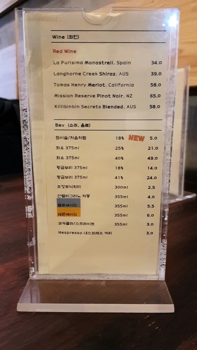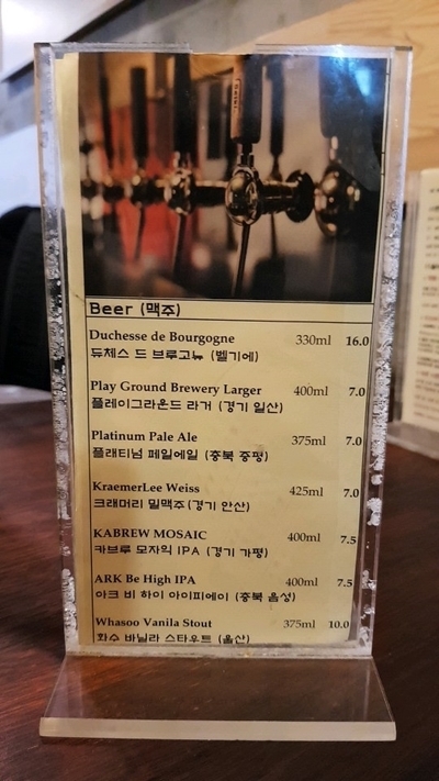 음료 메뉴판입니다. 이 집 맥주는 특이하게 맥주 이름 옆에 보시면 국내 곳곳의 지역 이름이 기재되어 있습니다.