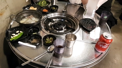 1. 곱창이 익혀나오기전 찌개와 육회 흡입!