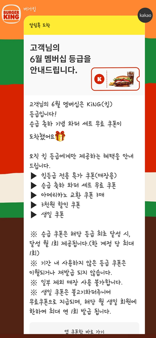 그러던 중 카카오톡 알림으로 받은 버거킹 'KING' 등급!