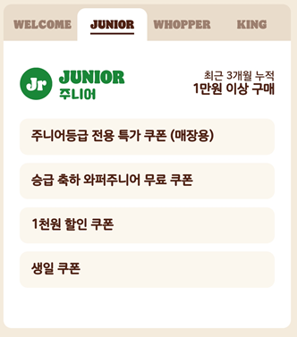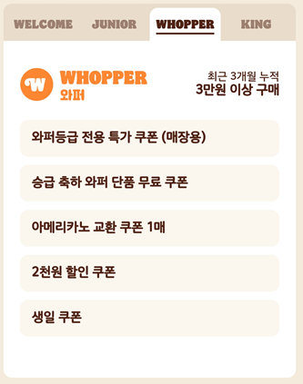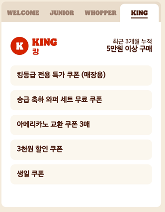 승급 축하로 와퍼 세트를 주고 킹등급 전용 특가 쿠폰(매장용)에