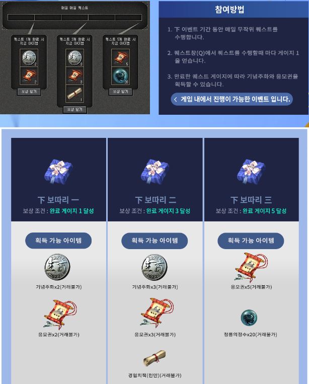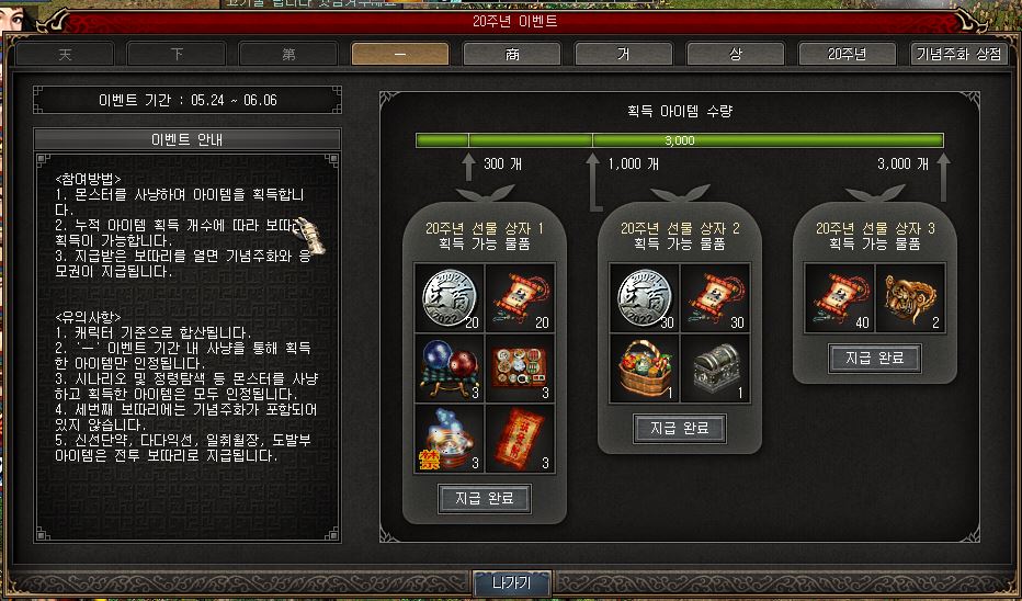 오늘까지 진행한 이벤트는 획득 아이템 수량 3000개 채우기!