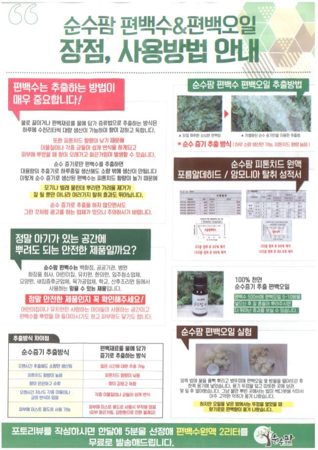 신선한 편백잎과 열매만을 이용 그리고 순수 증기를 이용해한 추출해