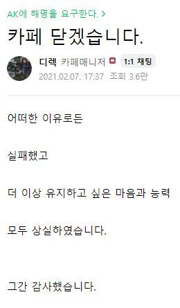결국엔 매니저 디렉님도 유지하고 싶은 마음이 사라져 카페를 닫는다는 글을 쓰신 상태입니다.