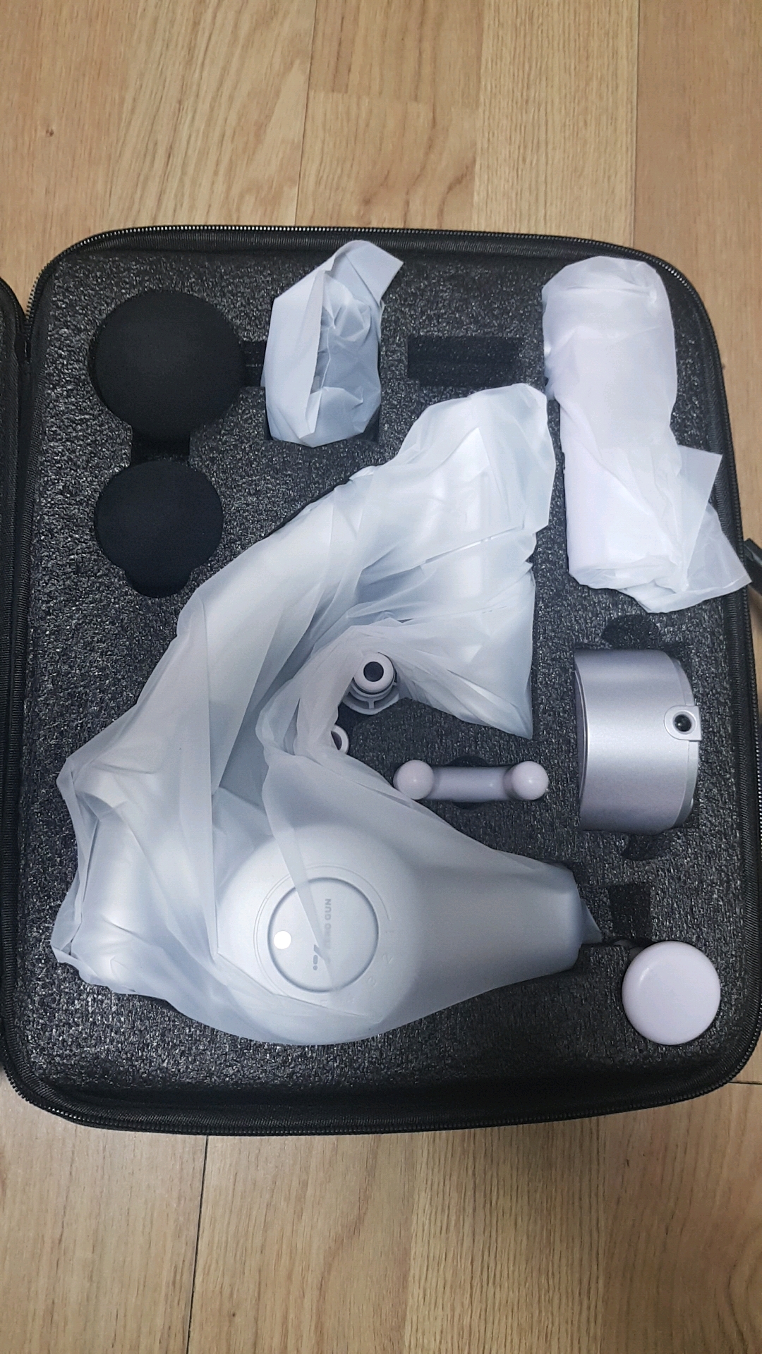 비닐을 벗겨 마사지건을 조립하시면 됩니다.